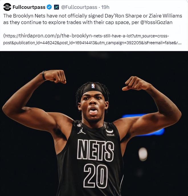 根據(jù)美媒Fullcourtpass的報(bào)道,布魯克林籃網(wǎng)隊(duì)還沒(méi)有正式跟戴羅恩-夏普、扎伊爾-威廉姆斯簽約,因?yàn)槠淙栽诶眯劫Y空間積極探索交易。