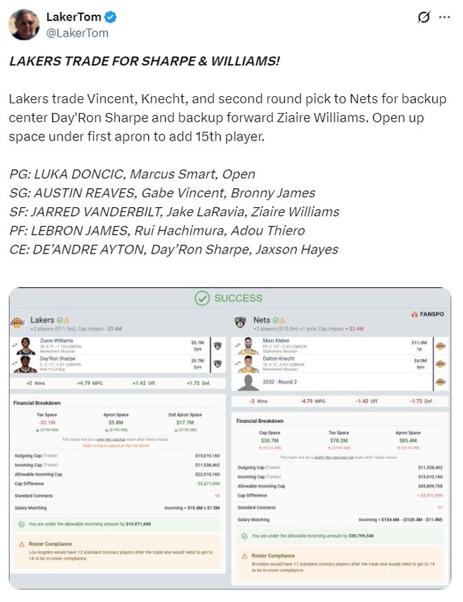 湖記Laker Tom建議湖人與籃網(wǎng)進(jìn)行交易,湖人送出馬克斯-克勒貝爾、道爾頓-克內(nèi)克特、2032年次輪簽換來(lái)扎威與夏普,這筆交易是3換2的,交易達(dá)成后——